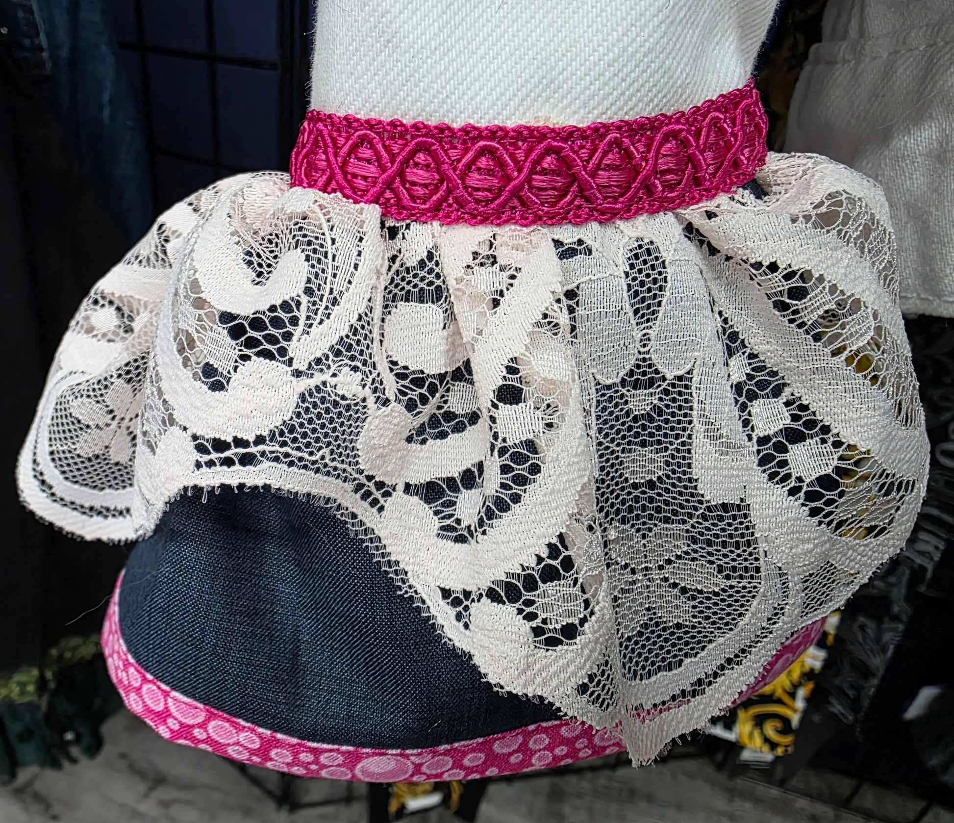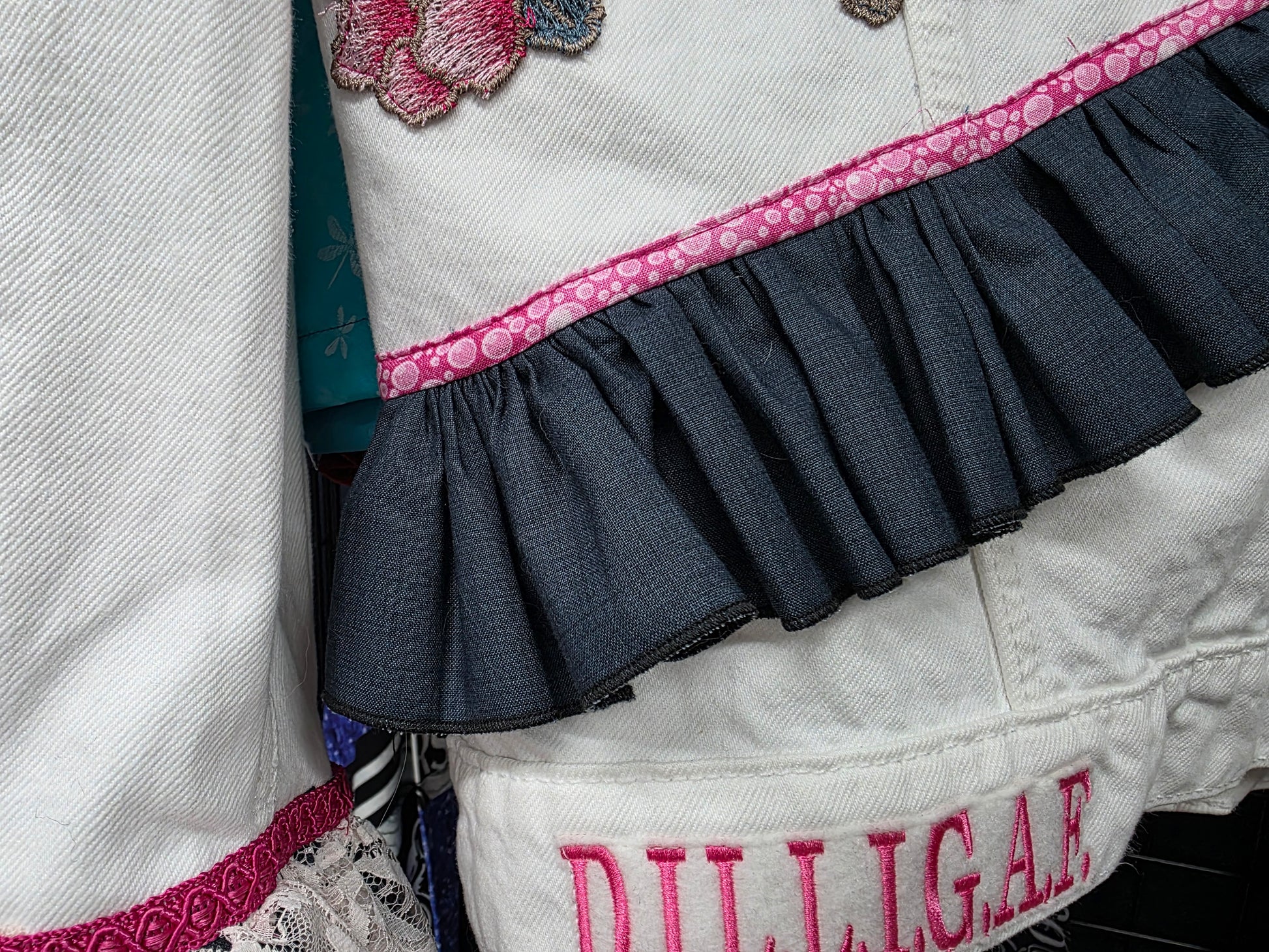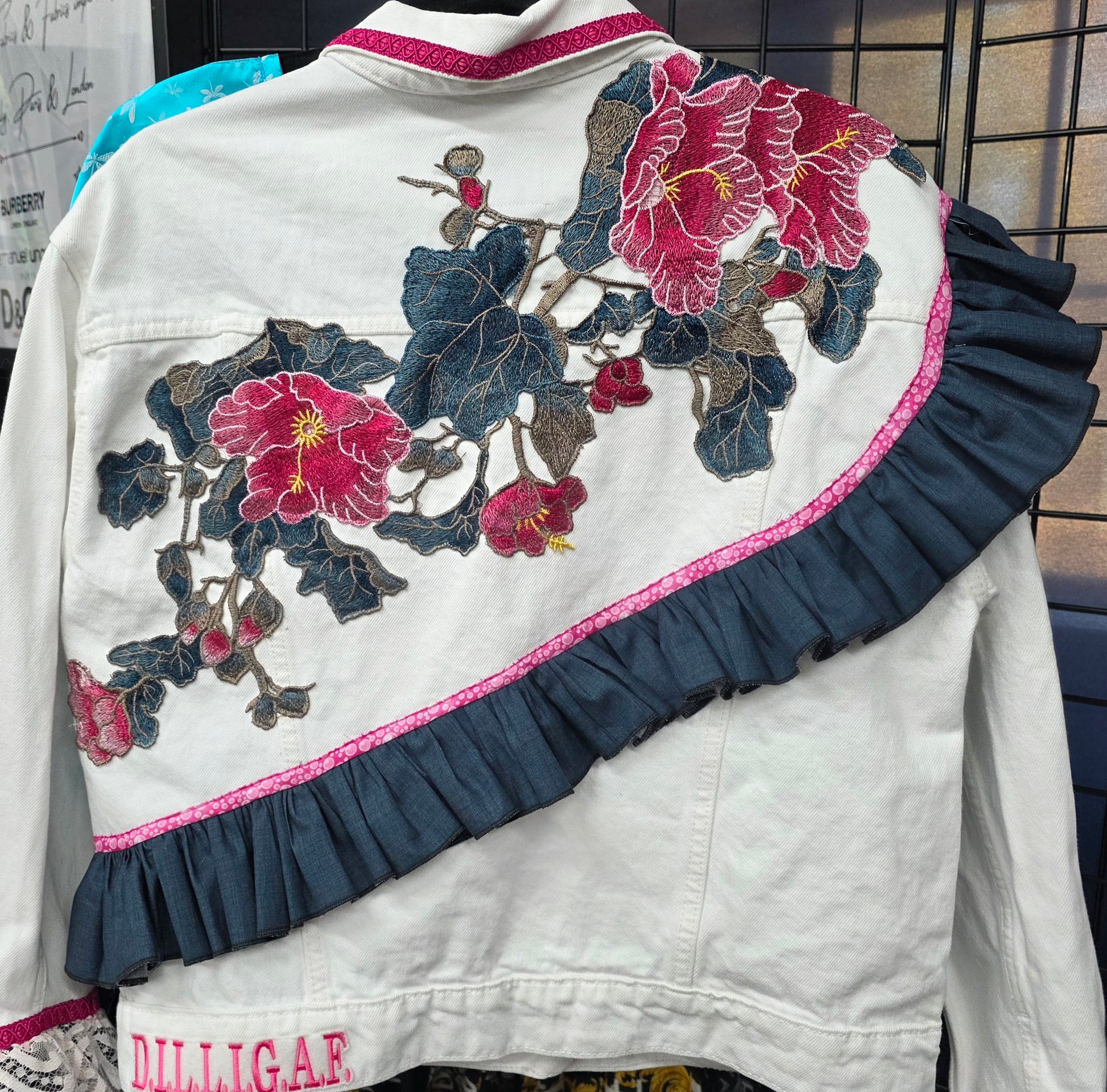This one-of-a-kind piece celebrates the power of transformation — where art, nature, and design intertwine. The crisp white denim serves as a canvas for an extraordinary floral appliqué that cascades across the back and over the shoulder, wrapping the body in movement and color.